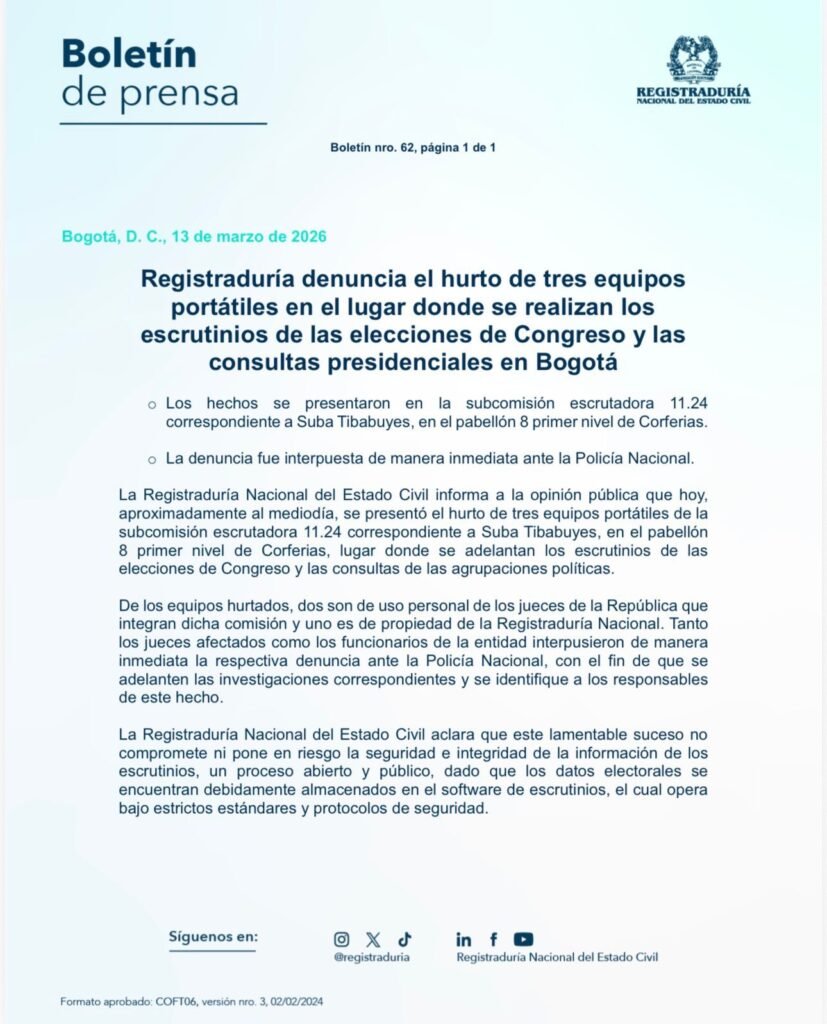 Según informó la entidad en un boletín oficial, el hecho ocurrió hacia el mediodía del 13 de marzo. De los equipos hurtados, dos pertenecían a jueces de la República que integran la comisión escrutadora y uno era de propiedad de la Registraduría.