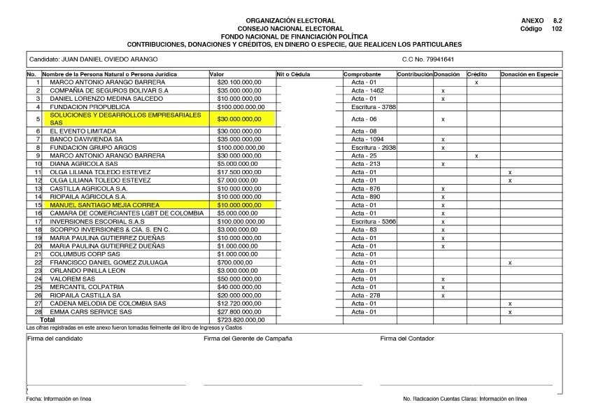 Reportes de financiación a la campaña a la Alcaldía de Juan Daniel Oviedo por parte de Soluciones y Desarrollos Empresariales y de Manuel Santiago Mejía, que fue socio de Santiago Uribe Vélez en la Hacienda La Carolina.