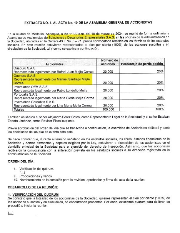 Participación de Manuel Santiago Mejía en la compañía Soluciones y Desarrollos Empresariales.
