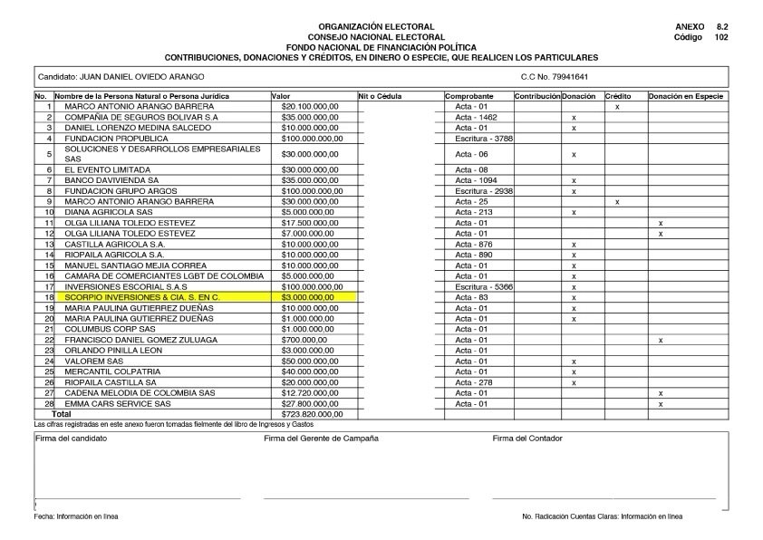 De acuerdo con el reportaje, uno de los principales aportantes fue el empresario Manuel Santiago Mejía, quien figura en los registros oficiales del sistema Cuentas Claras del Consejo Nacional Electoral. Según Vorágine, Mejía no solo realizó aportes directos a la campaña de Oviedo, sino que también participó mediante la empresa Soluciones y Desarrollos Empresariales, desde la cual se habrían canalizado recursos adicionales.