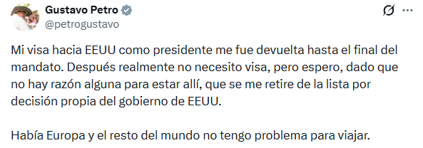 En su pronunciamiento, Petro señaló que no encuentra razones para continuar en ese listado y manifestó que espera una decisión del Gobierno estadounidense en ese sentido. Además, indicó que no tiene restricciones para viajar a otras regiones del mundo.